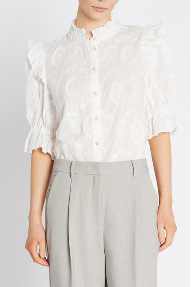 OBS! Fjernlager. Levering kan blive forlænget med 2-3 dage, hvis varen ikke findes i vores butik lige nu.Smuk skjortebluse fra Bruuns Bazaar med ½ lange let puffede ærmer, de flotteste broderet detaljer og små knapper langs fronten.