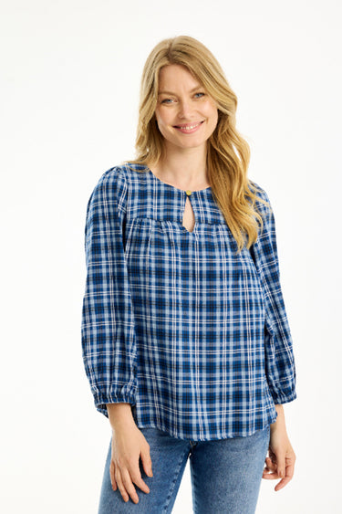 OBS! Fjernlager. Levering kan blive forlænget med 2-3 dage, hvis varen ikke findes i vores butik lige nu.Sød bluse fra In Front med lange ærmer, rund hals med en lille nøglehulsudskæring og det skønneste ternede print.