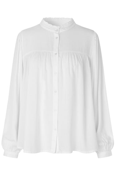 OBS! Fjernlager. Levering kan blive forlænget med 2-3 dage, hvis varen ikke findes i vores butik lige nu.Elegant skjortebluse fra Lollys Laundry med lange pufærmer, kinakrave i halsen og knaplukning langs fronten.Blusen har også lette flæseeffekter over brystet og en løs silhuet.