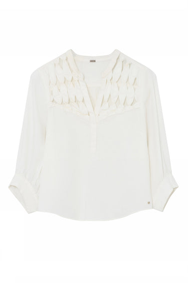 OBS! Fjernlager. Levering kan blive forlænget med 2-3 dage, hvis varen ikke findes i vores butik lige nu.Smuk skjortebluse fra Gustav med ¾ lange ærmer, rund hals med v-udskæring og de flotteste detaljer over brystet.