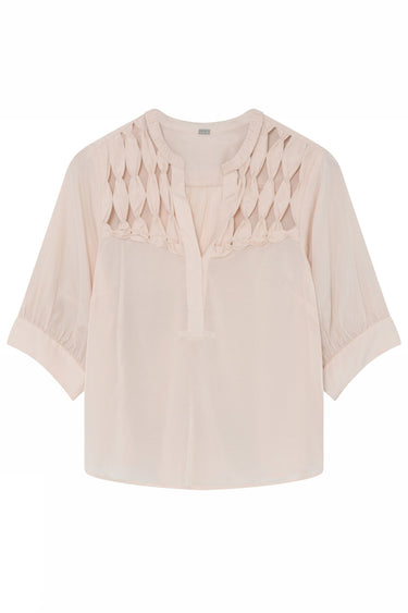 OBS! Fjernlager. Levering kan blive forlænget med 2-3 dage, hvis varen ikke findes i vores butik lige nu.Super sød skjortebluse fra Gustav med ½ lange ærmer, kinakrave med v-udskæring i halsen og de flotteste detaljer over brystet.