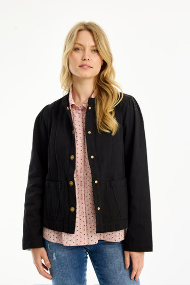 OBS! Fjernlager. Levering kan blive forlænget med 2-3 dage, hvis varen ikke findes i vores butik lige nu.Flot blazer jakke fra In Front med lange ærmer, kinakrave i halsen og små lommer foran.Jakken har også flotte syninger, let puf i skulderne og smukke guldknapper langs fronten.