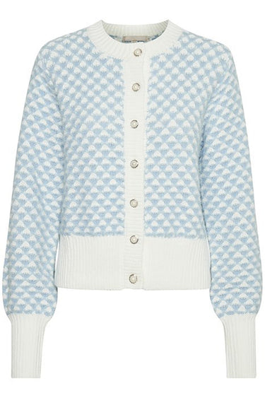 - OBS! Fjernlager. Levering kan blive forlænget med 1-2 dage, hvis varen ikke findes i vores butik lige nu.Super sød strikket cardigan fra Karen By Simonsen. Strikken har lange ærmer med brede ribstrikket kanter der går igen omkring bunden og i halsen. Den har også et flot mønster i fine nuancer og en dejlig blød kvalitet. Den lukkes med fine knapper langs fronten.