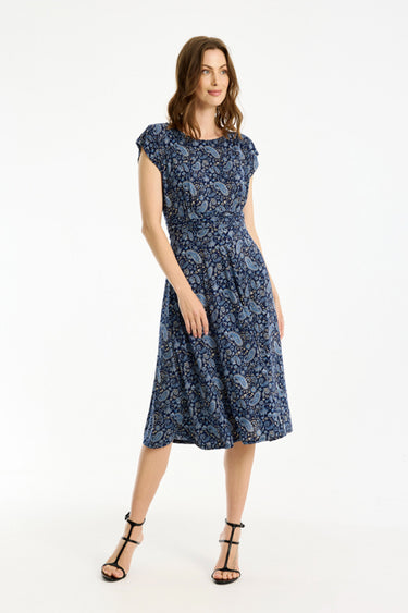 OBS! Fjernlager. Levering kan blive forlænget med 2-3 dage, hvis varen ikke findes i vores butik lige nu.Feminin kjole fra In Front med små ærmer, bådudskæring i halsen og et bredt bindebælte i taljen. Kjolen har også en dejlig blød kvalitet og det skønneste farverige print.