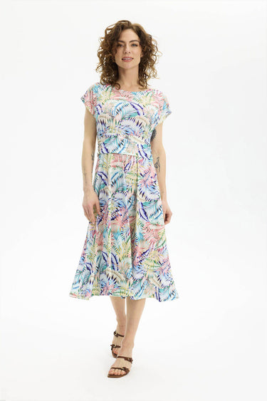 - OBS! Fjernlager. Levering kan blive forlænget med 2-3 dage, hvis varen ikke findes i vores butik lige nu.Feminin kjole fra In Front med små ærmer, bådudskæring i halsen og et bredt bindebælte i taljen. Kjolen har også en dejlig blød kvalitet og det skønneste farverige print.