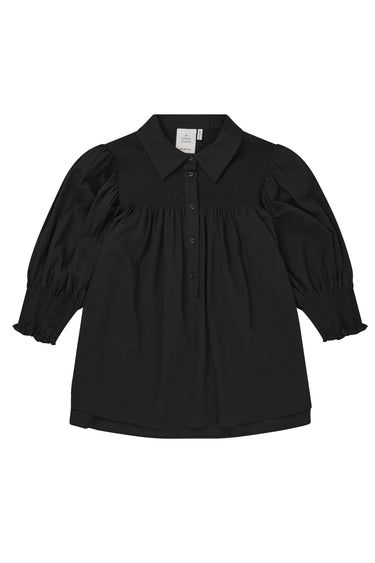 Elegant top fra Munthe med ½ lange pufærmer, skjortekrave i halsen og knaplukning langs fronten.Toppen har også smock over brystet og en afslappet silhuet.