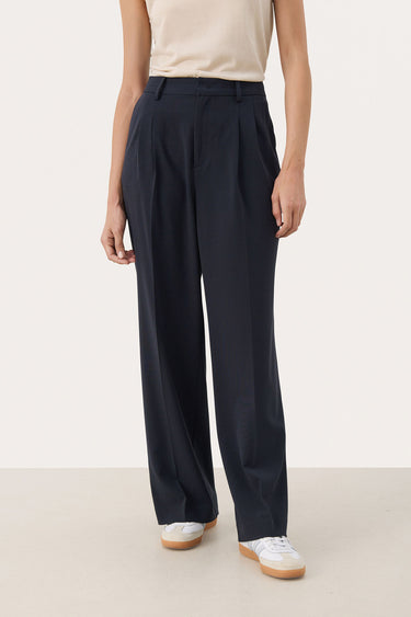 OBS! Fjernlager. Levering kan blive forlænget med 2-3 dage, hvis varen ikke findes i vores butik lige nu.Smarte bukser fra Part Two med vidde i benene, læg og pressefolder langs fronten og et flot klassisk udtryk.