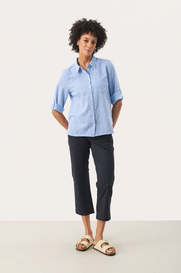 OBS! Fjernlager. Levering kan blive forlænget med 2-3 dage, hvis varen ikke findes i vores butik lige nu.Smart skjortebluse fra Part Two med ¾ lange ærmer, krave i halsen og en lille lomme på brystet.Blusen har også en dejlig afslappet silhuet og fine knapper langs fronten.