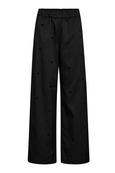 OBS! Fjernlager. Levering kan blive forlænget med 2-3 dage, hvis varen ikke findes i vores butik lige nu.Super flotte bukser fra Co'couture med en bred elastikkant i taljen, vidde i benene og fine små broderet prikker.