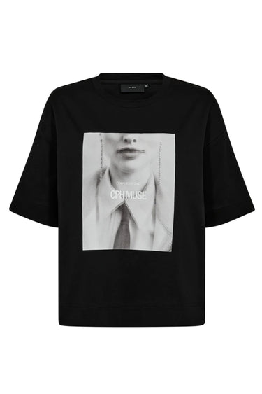 Cool T-shirt i en eksklusiv, tyk bomuldskvalitet fra Copenhagen Muse. T-shirten er enkel i modellen med rib i den runde halsudskæring, et unikt Muse print på fronten samt korte ærmer med drop shoulders, der understreger den oversize silhuet.