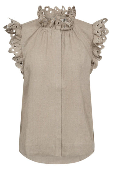 OBS! Fjernlager. Levering kan blive forlænget med 2-3 dage, hvis varen ikke findes i vores butik lige nu.Fin skjorte fra Copenhagen Muse i en let kvalitet af 100% hør med skjult knaplukning på fronten, flæsekrave samt dobbelt flæsekanter, der giver et fint, lille ærme.