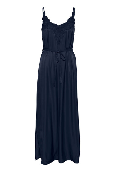 - OBS! Fjernlager. Levering kan blive forlænget med 2-3 dage, hvis varen ikke findes i vores butik lige nu.Smuk kjole fra Cream med smalle justerbare skulderstropper, et smalt bindebånd i taljen og små slidser i siderne. Kjolen er også detaljeret med det flotteste broderi over brystet.