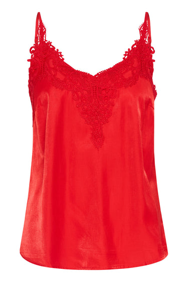 - OBS! Fjernlager. Levering kan blive forlænget med 2-3 dage, hvis varen ikke findes i vores butik lige nu.Feminin top fra Cream med smalle justerbare skulderstropper og smukke blondedetaljer.