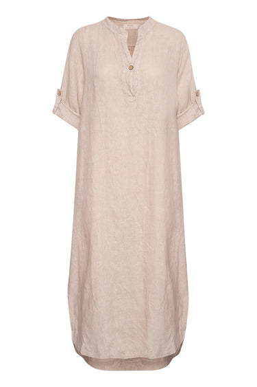 OBS! Fjernlager. Levering kan blive forlænget med 2-3 dage, hvis varen ikke findes i vores butik lige nu.Flot enkel kjole fra Cream med ¾ lange ærmer, v-udskæring i halsen og et kort knappanel over brystet.Kjolen har også en blød hør kvalitet og en afslappet silhuet.