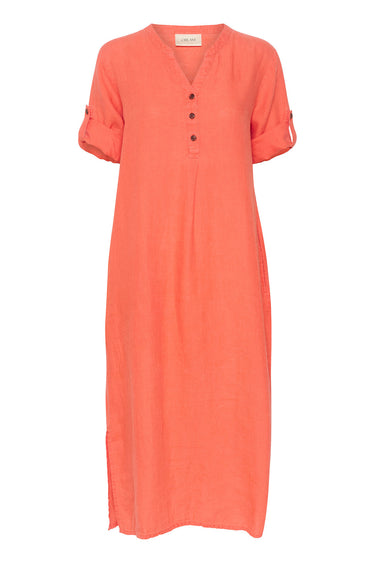 OBS! Fjernlager. Levering kan blive forlænget med 2-3 dage, hvis varen ikke findes i vores butik lige nu.Flot enkel kjole fra Cream med ¾ lange ærmer, v-udskæring i halsen og et kort knappanel over brystet.Kjolen har også en blød hør kvalitet og en afslappet silhuet.