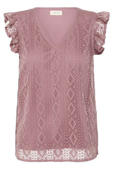 - OBS! Fjernlager. Levering kan blive forlænget med 2-3 dage, hvis varen ikke findes i vores butik lige nu.Elegant tee fra Cream med små flæseærmer, v-udskæring i halsen og et skønt feminint udtryk.