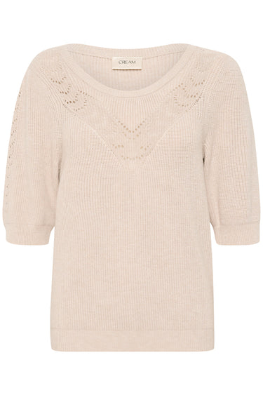 OBS! Fjernlager. Levering kan blive forlænget med 2-3 dage, hvis varen ikke findes i vores butik lige nu.Sød strik fra Cream med korte pufærmer, rund hals og de fineste broderet detaljer over brystet.