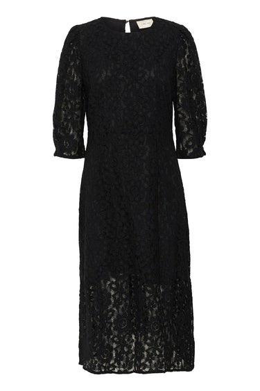 OBS! Fjernlager. Levering kan blive forlænget med 2-3 dage, hvis varen ikke findes i vores butik lige nu.Smuk blondekjole fra Cream med ¾ lange ærmer, bådudskæring i halsen og en feminin silhuet.