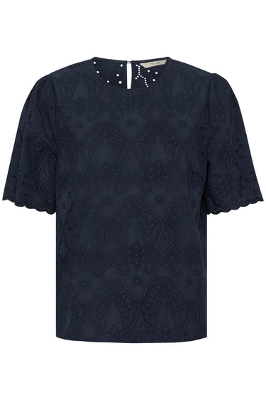 - OBS! Fjernlager. Levering kan blive forlænget med 2-3 dage, hvis varen ikke findes i vores butik lige nu.Feminin blus fra Cream med korte ærmer, rund hals og en smukt broderi anglaise kvalitet.