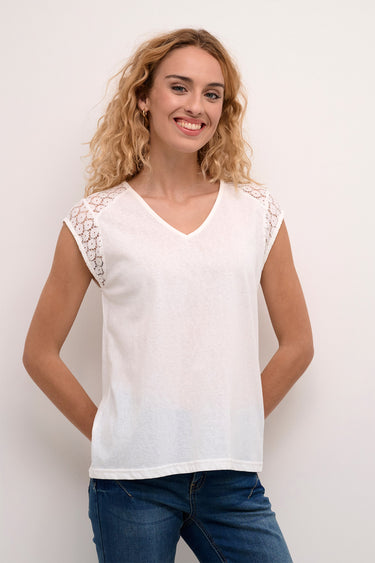 - OBS! Fjernlager. Levering kan blive forlænget med 2-3 dage, hvis varen ikke findes i vores butik lige nu.Sød og enkel top fra Cream med korte ærmer, v-udskæring i halsen og fine blondedetaljer over skulderne.