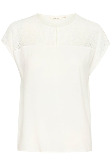- OBS! Fjernlager. Levering kan blive forlænget med 2-3 dage, hvis varen ikke findes i vores butik lige nu.Feminin bluse fra Cream med korte ærmer, rund hals og en smuk blondekvalitet omkring skulderne.