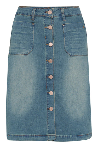 OBS! Fjernlager. Levering kan blive forlænget med 2-3 dage, hvis varen ikke findes i vores butik lige nu.Smart denim nederdel fra Cream med fine lommer i siderne, knaplukning foran og en let slidt vask.