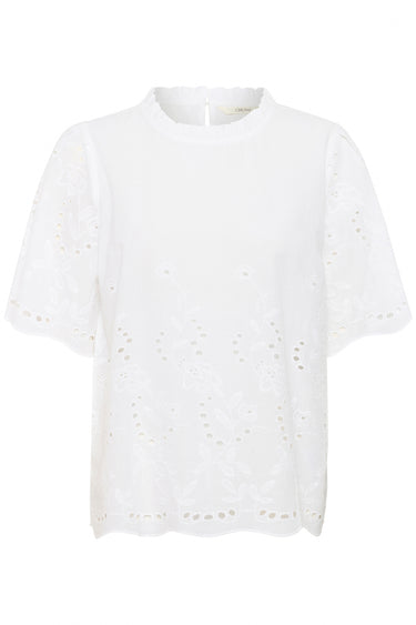 - OBS! Fjernlager. Levering kan blive forlænget med 2-3 dage, hvis varen ikke findes i vores butik lige nu.Elegant top fra Cream med en super fin broderi anglaise kvalitet, rund hals og korte ærmer.