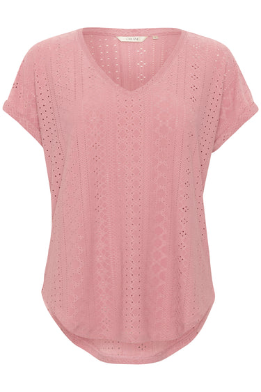 - OBS! Fjernlager. Levering kan blive forlænget med 2-3 dage, hvis varen ikke findes i vores butik lige nu.Fin tee fra Cream med korte ærmer og v-udskæring i halsen.