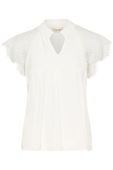 - OBS! Fjernlager. Levering kan blive forlænget med 2-3 dage, hvis varen ikke findes i vores butik lige nu.Smuk top fra Cream med v-udskæring i halsen go de skønneste blondeærmer der giver den et rigtig fint og feminint udtryk.