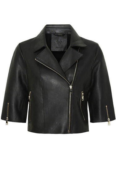 Kort skindjakke fra Notyz med korte ærmer, åben krave i halsen og cool lynlåsdetaljer der giver den et råt udtryk.Jakken lukkes også langs fronten med en klassisk asymmetrisk lynlås.