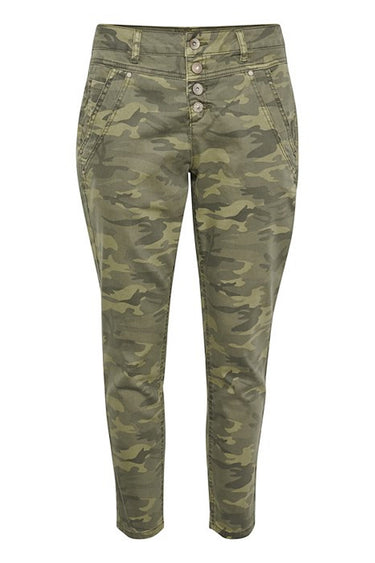 OBS! Fjernlager. Levering kan blive forlænget med 2-3 dage, hvis varen ikke findes i vores butik lige nu.Cool bukser fra Cream med en bred elastikkant i taljen, cool lommer og smarte knapdetaljer i fronten.Bukserne har også en cropped længde, en tætsiddende pasform og et cool camo print.