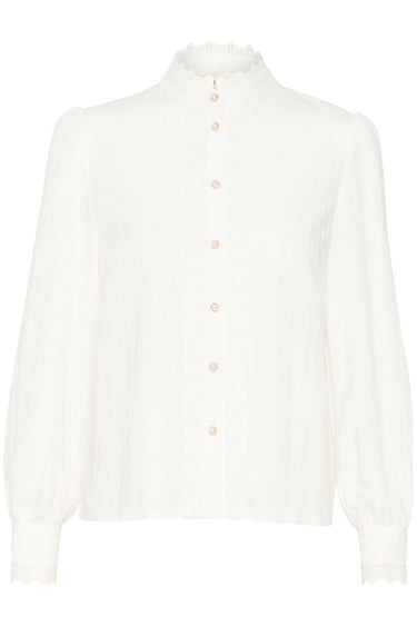 - OBS! Fjernlager. Levering kan blive forlænget med 2-3 dage, hvis varen ikke findes i vores butik lige nu.Feminin bluse fra Cream med lange let puffede ærmer, høj hals og knaplukning foran med fine broderet detaljer.