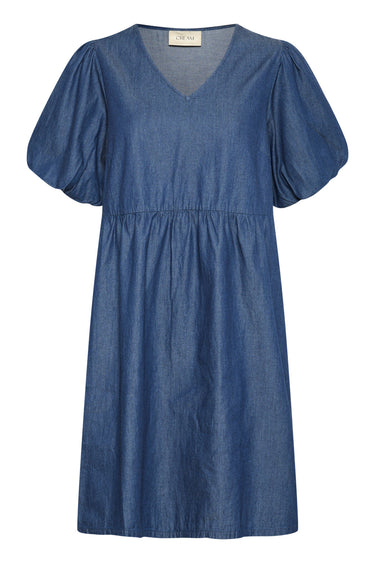 OBS! Fjernlager. Levering kan blive forlænget med 2-3 dage, hvis varen ikke findes i vores butik lige nu.Sød denim kjole fra Cream med korte pufærmer, v-udskæring i halsen og et klassisk A-snit.