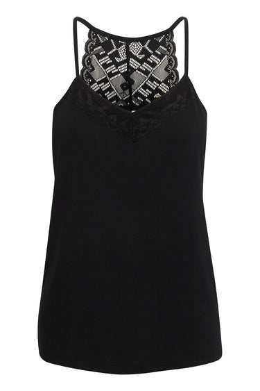 OBS! Fjernlager. Levering kan blive forlænget med 2-3 dage, hvis varen ikke findes i vores butik lige nu.Feminin top fra Cream med smalle skulderstropper, en slim-fit silhuet og smukke blonde detaljer i ryggen og over brystet.