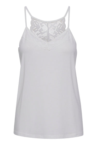 - OBS! Fjernlager. Levering kan blive forlænget med 2-3 dage, hvis varen ikke findes i vores butik lige nu.Feminin top fra Cream med smalle skulderstropper, en slim-fit silhuet og smukke blonde detaljer i ryggen og over brystet.