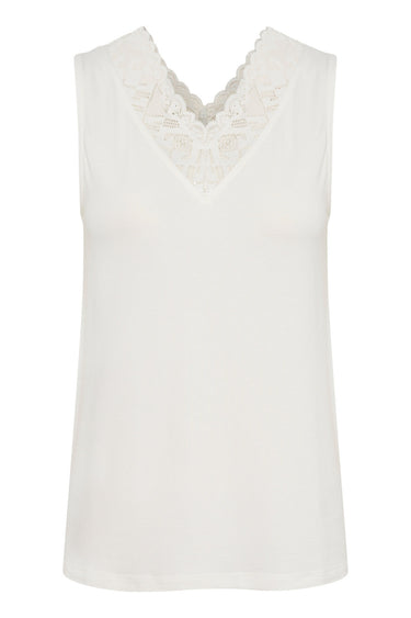 - OBS! Fjernlager. Levering kan blive forlænget med 2-3 dage, hvis varen ikke findes i vores butik lige nu.Feminin top fra Cream med v-udskæring i halsen, brede skulderstropper og flotte blondedetaljer.