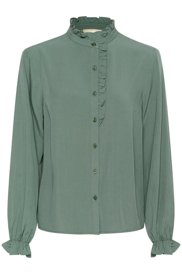 OBS! Fjernlager. Levering kan blive forlænget med 2-3 dage, hvis varen ikke findes i vores butik lige nu.Feminin skjortebluse fra Cream med lange pufærmer, en fin flæsekant i halsen og knaplukning langs fronten.