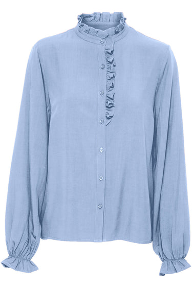 OBS! Fjernlager. Levering kan blive forlænget med 2-3 dage, hvis varen ikke findes i vores butik lige nu.Feminin skjortebluse fra Cream med lange pufærmer, en fin flæsekant i halsen og knaplukning langs fronten.