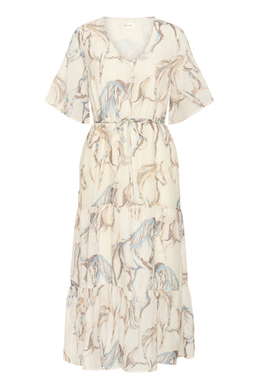 OBS! Fjernlager. Levering kan blive forlænget med 2-3 dage, hvis varen ikke findes i vores butik lige nu.Feminin kjole fra Cream med korte ærmer, v-udskæring i halsen og et smalt bindebælte i taljen.Kjolen har også brede flæselag i skørtet og et super fint print.