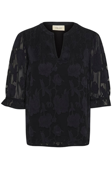 - OBS! Fjernlager. Levering kan blive forlænget med 2-3 dage, hvis varen ikke findes i vores butik lige nu.Smuk blondebluse fra Cream med korte pufærmer, rund hals med v-udskæring og en feminin silhuet.