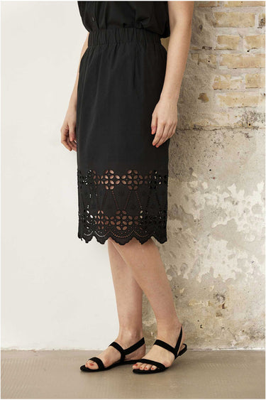 - OBS! Fjernlager. Levering kan blive forlænget med 2-3 dage, hvis varen ikke findes i vores butik lige nu.Fin nederdel fra In Front med en bred elastikkant i taljen, et lige snit og det fineste hullet mønster i bunden.