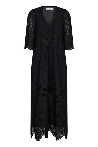 OBS! Fjernlager. Levering kan blive forlænget med 2-3 dage, hvis varen ikke findes i vores butik lige nu.Smuk blondekjole fra Haute L'Amitié med korte ærmer, v-udskæring i halsen og den flotteste broderet kvalitet der giver et feminint udtryk med et enkelt snit.