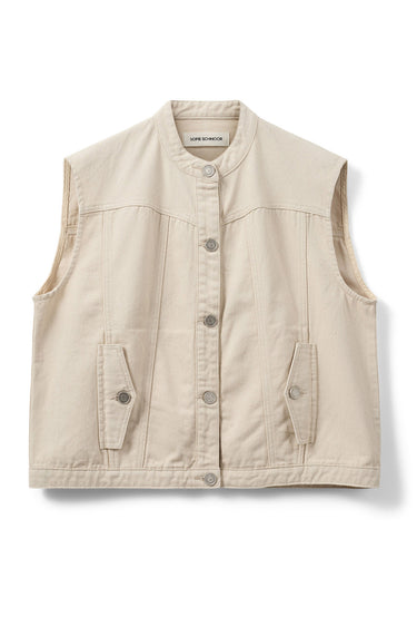 OBS! Fjernlager. Levering kan blive forlænget med 2-3 dage, hvis varen ikke findes i vores butik lige nu.Smart denim vest fra Sofie Schnoor med rund hals, fine lommeflapper i siderne og knaplukning langs fronten.
