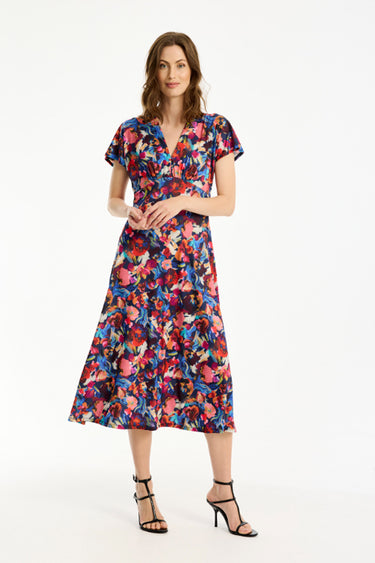 OBS! Fjernlager. Levering kan blive forlænget med 2-3 dage, hvis varen ikke findes i vores butik lige nu.Smuk kjole fra In Front med små ærmer, v-udskæring i halsen og en feminin silhuet.Kjolen har også en dejlig blød kvalitet og det flotteste farverige print.
