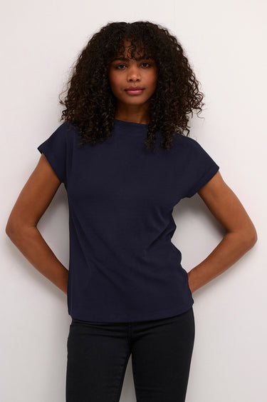 OBS! Fjernlager. Levering kan blive forlænget med 1-2 dage, hvis varen ikke findes i vores butik lige nu.Sød t-shirt fra Karen By Simonsen med korte ærmer og høj hals. T-shirten har en dejlig kvalitet og et flot stilrent udtryk.