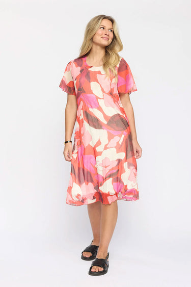 - OBS! Fjernlager. Levering kan blive forlænget med 2-3 dage, hvis varen ikke findes i vores butik lige nu.Sød kjole fra 2-Biz med korte ærmer, rund hals og en flot plisseret kvalitet.