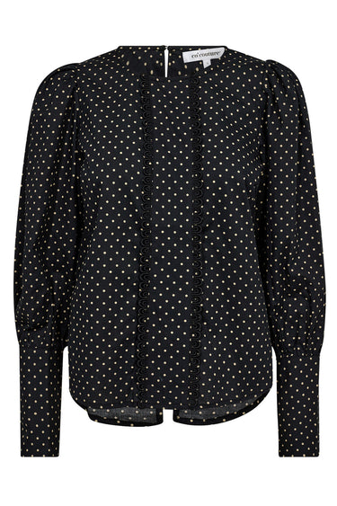 OBS! Fjernlager. Levering kan blive forlænget med 2-3 dage, hvis varen ikke findes i vores butik lige nu.Flot bluse fra Co'couture med lange ærmer, brede tætsiddende manchetter og rund halsudskæring.Blusen har også åben ryg med sløjfelukning og et fint prikket print.