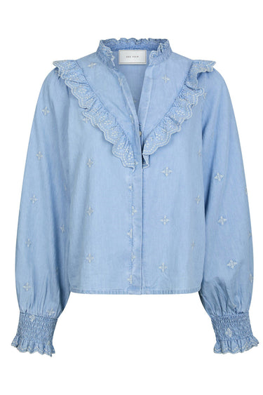 OBS! Fjernlager. Levering kan blive forlænget med 2-3 dage, hvis varen ikke findes i vores butik lige nu.Feminin bluse fra Neo Noir med lange ærmer, v-udskæring og skjult knaplukning langs fronten.Blusen har også smukke broderet flæsedetaljer og smockkanter omkring manchetterne.
