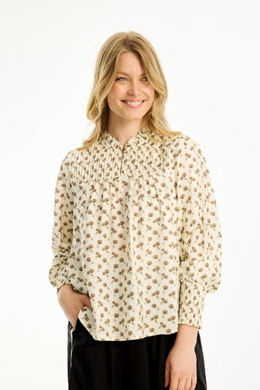 OBS! Fjernlager. Levering kan blive forlænget med 2-3 dage, hvis varen ikke findes i vores butik lige nu.Sød bluse fra In Front med lange pufærmer, tætsiddende smock manchetter og det fineste mini print med små blomster.