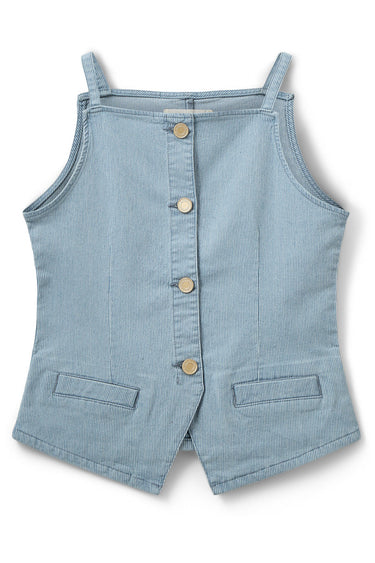 - OBS! Fjernlager. Levering kan blive forlænget med 2-3 dage, hvis varen ikke findes i vores butik lige nu.Super fin denim vest fra Sofie Schnoor med smalle skulderstropper, et klassisk snit og flotte guldknapper langs fronten.